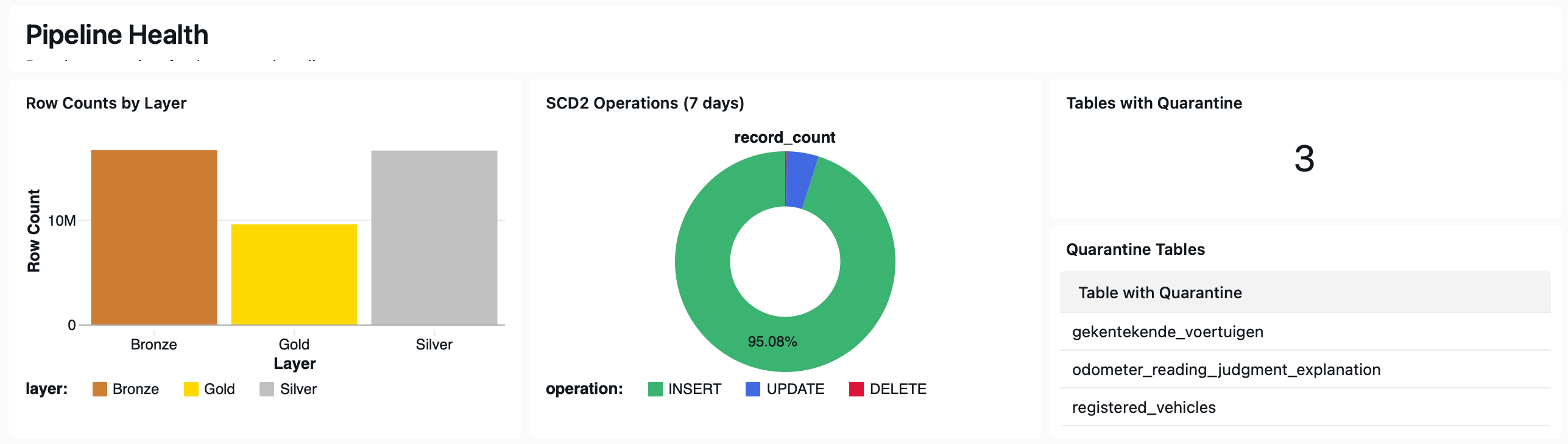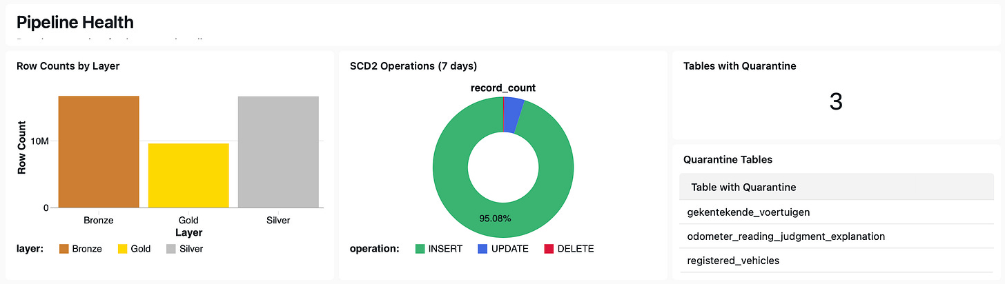 The generated job overview page included job run results and statistics. It also gave metrics about pipeline health, such as SCD2 operations and quarantined tables.