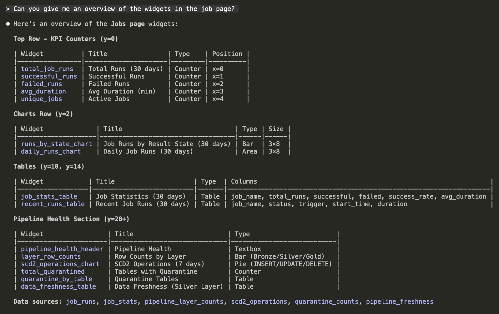 It was then time to let Claude loose on a new page for job overviews and statistics. We prompted to generate a job overview describing jobs in the current project (which can be read from databricks.yml), and use the system tables to automatically identify and construct datasets regarding metrics of these jobs.