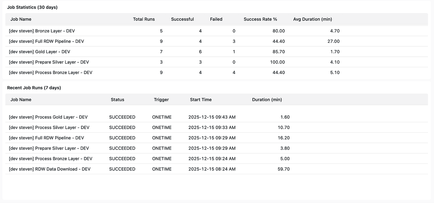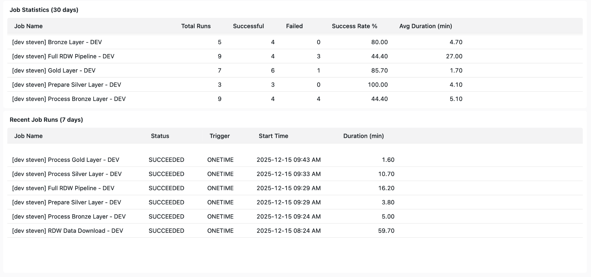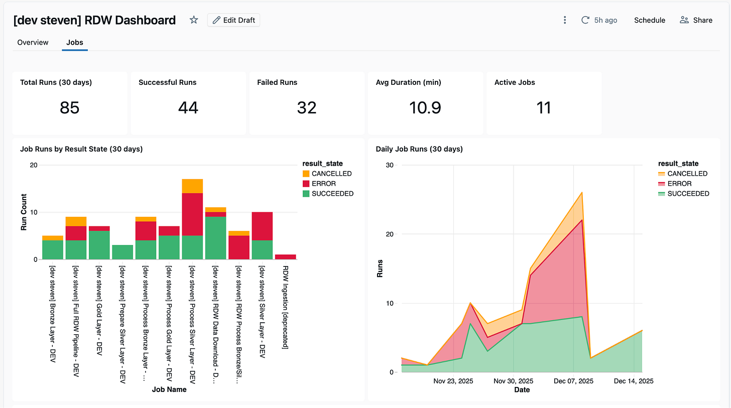 In our project we used Claude to build a job overview page. The overview page of our dashboard was built manually in the Databricks UI, and was given as a starting point for Claude. We recommend that you give Claude at least something (i.e., a few widgets) to start with, to help generate some context and syntax understanding. Whilst JSON rules are set, the dashboard syntax is not publicly available and hence we are essentially reverse-engineering it. This combined with a subagent in markdown (you could also use a skill) gave the best results for us. The subagent definition can be found here. The dashboard below was provided as context and created manually.
