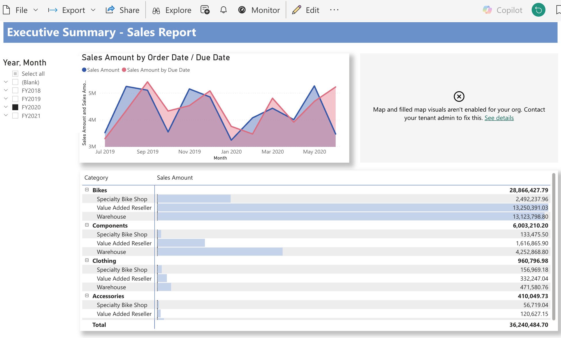 The AdventureWorks dashboard was an existing Power BI report with more complexity: multiple tables joined together, a filled map, and most importantly slicers. The aim was to test cross-filtering, the behaviour that Power BI users rely on most and take for granted.