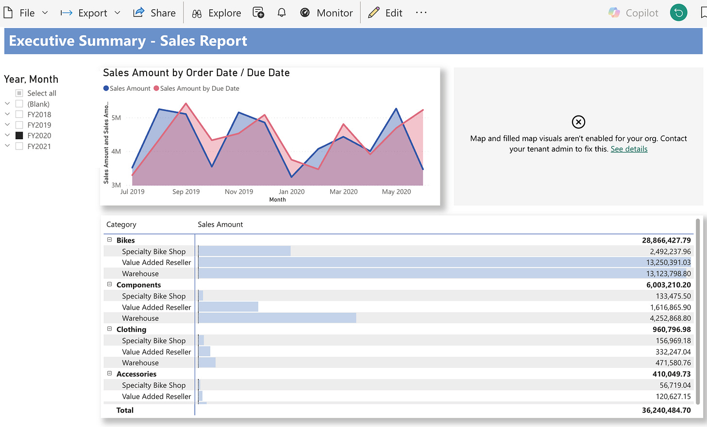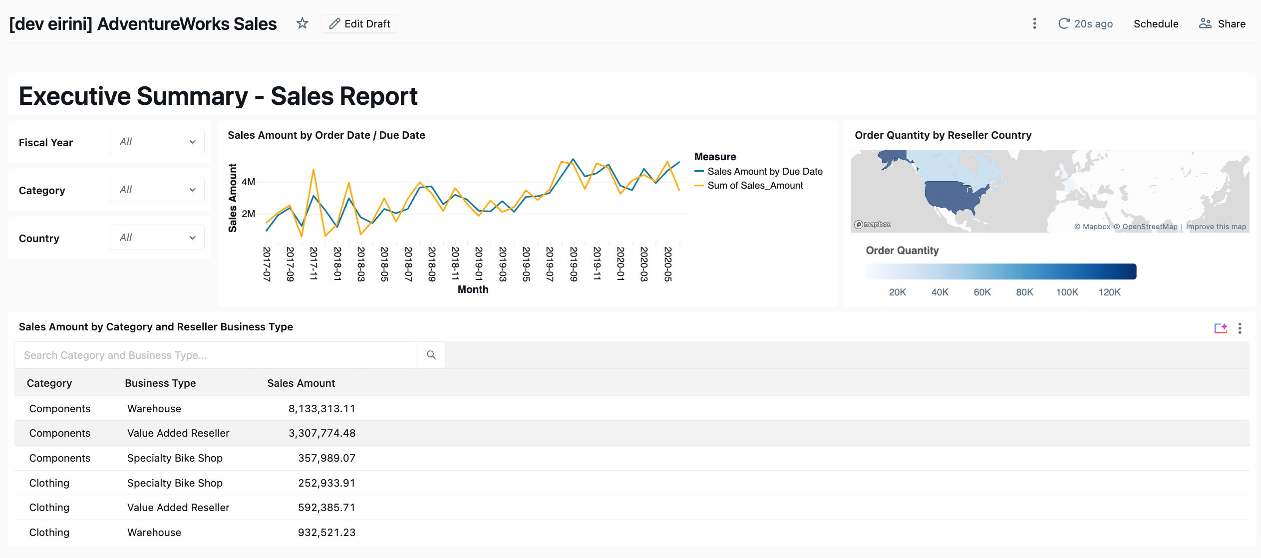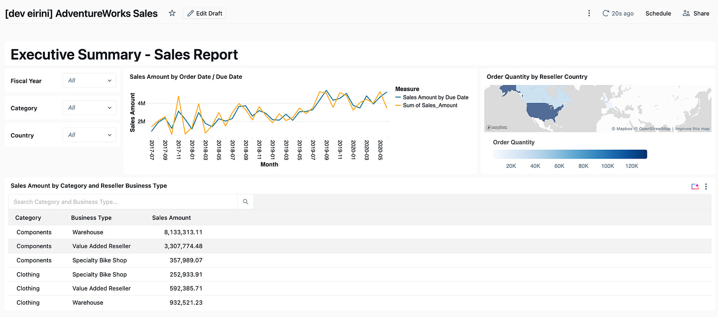 The AdventureWorks line chart needed a UNION ALL of two queries (Sales by Order Date and Sales by Due Date). But putting the choropleth map and table on the same UNION ALL dataset caused double-counting — every row appeared twice. We tested a single dataset; the numbers were wrong.