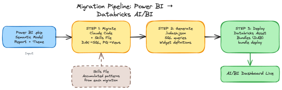 I used Claude Code to set up a project containing Power BI reports, to create the Databricks AI/BI Dashboards according to the skills file, and to deploy them with Databricks Asset Bundles (DAB). The aim is to figure out the proper instructions and construct a Claude skills file that can adapt Power BI dashboards to AI/BI dashboards directly. In addition, the effort is not limited to a one-to-one matching of the visualisations but also to mimic the interactions and to construct a dataset that can produce the expected results. For this reason, the project is looking into an overall migration from Power BI to Databricks AI/BI Dashboards.