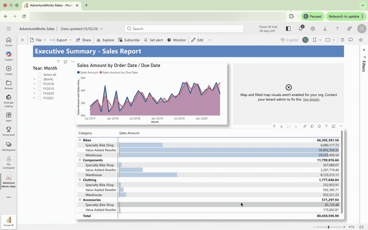 I used three different Power BI reports to investigate multiple components. On the first dashboard (Bakehouse Sales) I wanted to investigate what happens when a table has DAX measures, transformations, and Power Query code. On the second dashboard (Adventure Works) the aim was cross-filtering a characteristic that is very important for Power BI reports and expected behaviour. On the third report (Sample Superstore) the aim was to test the skills file.