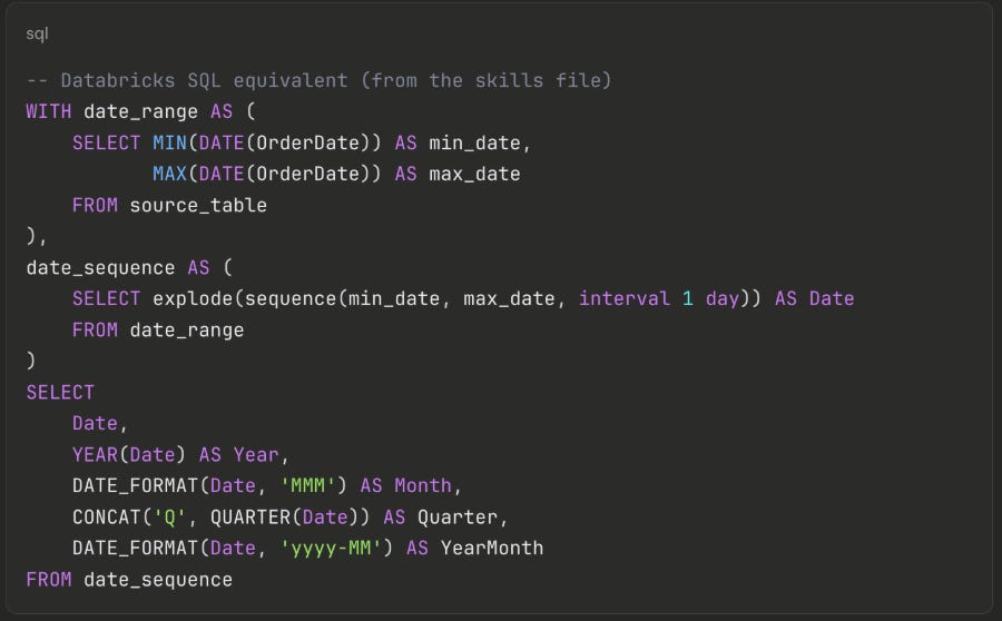 CALENDAR+ADDCOLUMNShas no direct SQL equivalent — and this was the first thing that broke. The solution isexplode(sequence())combined withDATE_FORMAT, which the skills file now captures as a reusable template: