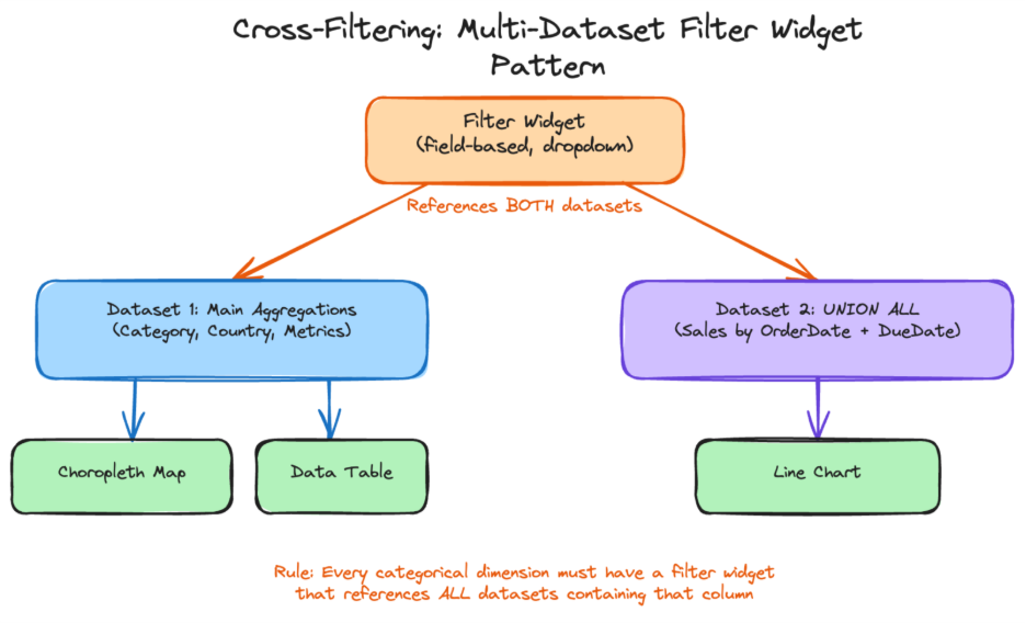 Solution: The solution was two datasets connected by filter widgets that reference both. A single filter widget can query the same field from multiple datasets. When the user selects a value, both datasets filter simultaneously. This required adding JOINs to the UNION ALL dataset so that categorical fields (Category, Country) existed in both datasets. The rule that emerged: