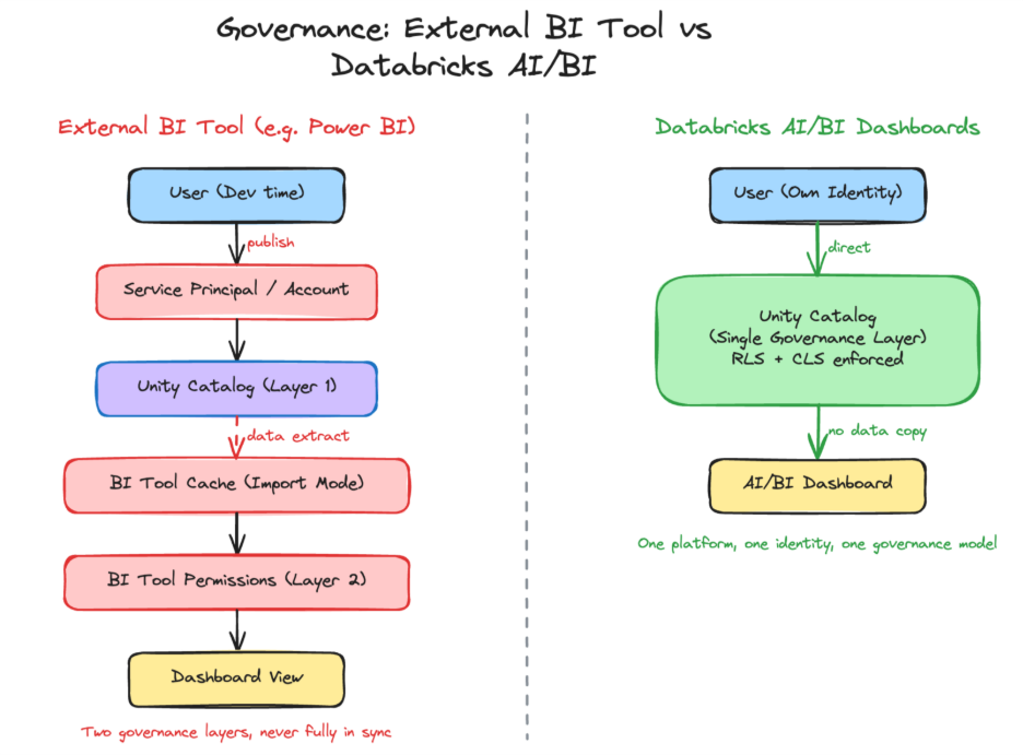 With Databricks, the governance story is straightforward: Unity Catalog provides unified access control across all data assets. For native AI/BI Dashboards, that’s where it ends. The moment you introduce an external BI tool, that clean story breaks down.