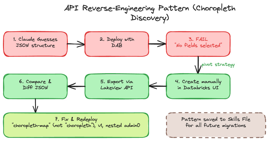 Solution: Rather than continuing to guess, I asked Claude to query the Databricks Lakeview API (GET /api/2.0/lakeview/dashboards/<id>) to export a working choropleth created manually in the UI. Three things were wrong: the widget type is "choropleth-map" (not "choropleth"), the version is 1 (not 3), and the region encoding uses a nested admin0 object with geographicRole.