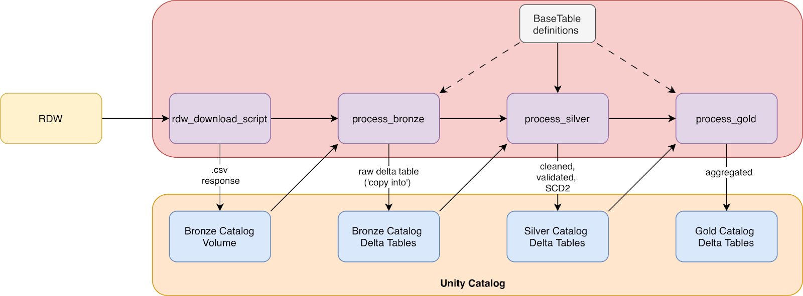 This post explored the basic structure of our RDW data processing pipeline and gives a high-level overview of the project. It includes the processing steps required for implementing the Medallion architecture in Databricks with custom code. A few things stood out during implementation. First, defining table schemas upfront with Pydantic paid dividends throughout the project. Column mappings, type conversions, primary keys, and documentation all flow from a single source of truth. Second, proper job orchestration is key: the for_each job pattern in Databricks Asset Bundles made it efficient to scale from one table to ten without duplicating job definitions, using a single script that fits all tables. Lastly, the layered approach proved its worth: when business logic needed adjusting, silver could be rebuilt from bronze without re-downloading from source.