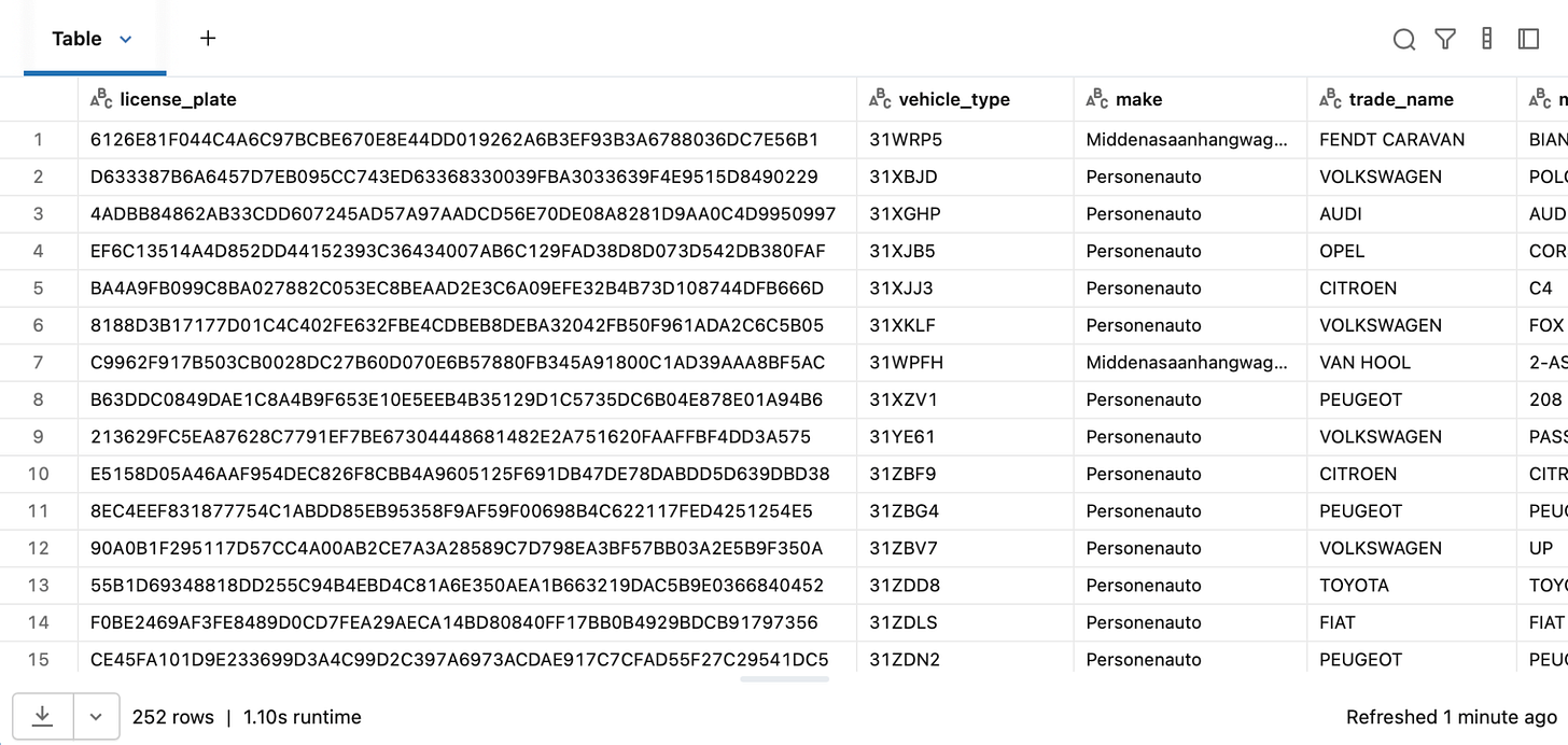 All data that does not comply with the validation checks ends up in the specified quarantine catalog. In our case we successfully caught a batch of data where improper formatting was found. Here, the license plate format check (LENGTH(license_plate) = 6) was triggered, and it seemed that all columns had shifted right. The `license_plate` column was substituted by what appears to be a row hash, hence all other columns had invalid, shifted data as well. The screenshot below shows the invalid data that was quarantined: