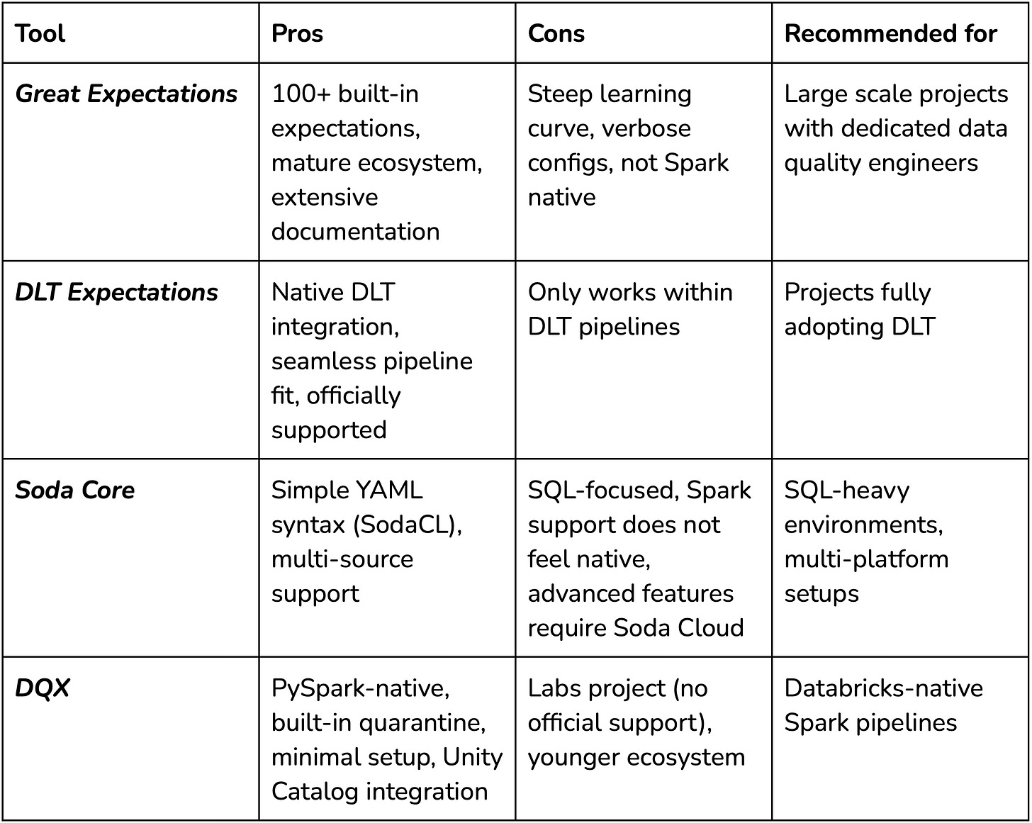 The data quality tooling landscape for Spark workloads has several options, each with different trade-offs. Some of the most popular alternatives include Great Expectations, DLT Expectations, and Soda Core.